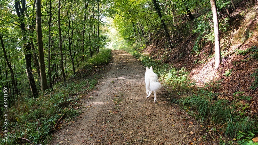 Hund (Weißer Schäferhund, Berger Blanc Suisse) läuft voraus beim Gassi Gehen im Wald