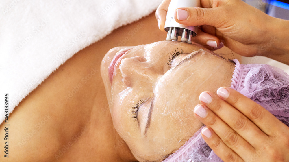 Woman in a spa salon on cosmetic procedures for facial care. Beautician makes medical procedures using a medical equipment. Cosmetologist making a woman a therapeutic procedure on a face.