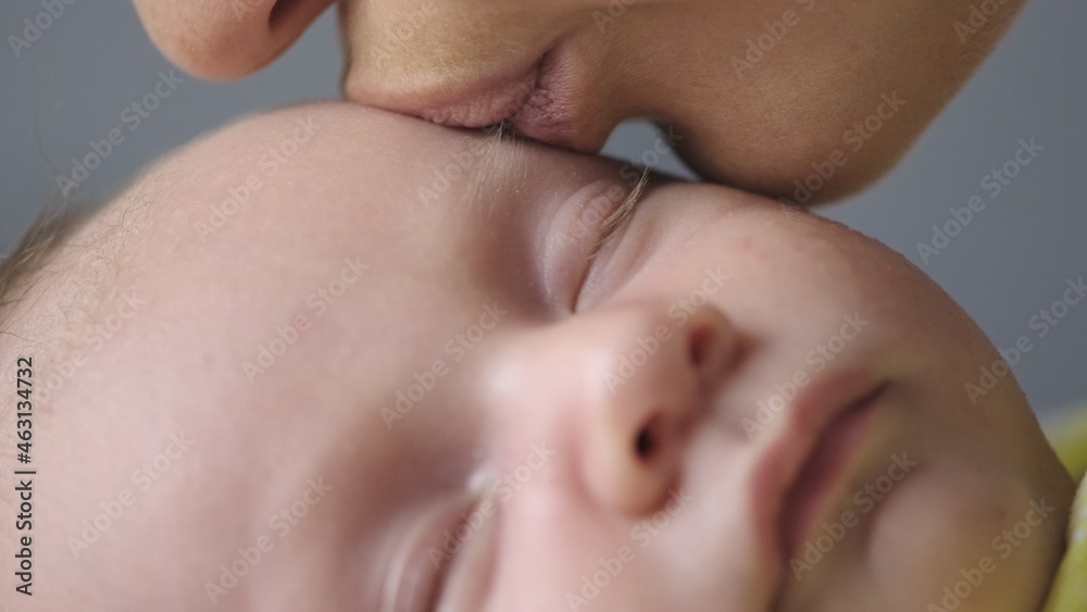 mother kissing her sons feet. Close up shot of a loving mothers kiss. Mom kissing baby's fingers on leg. .Mum cares of her infant baby.