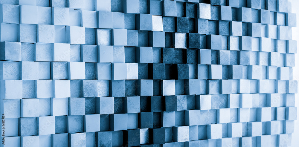 Wood block wall cubic texture background in blue filter . Modern contempolary woodwork wallpaper artwork design .