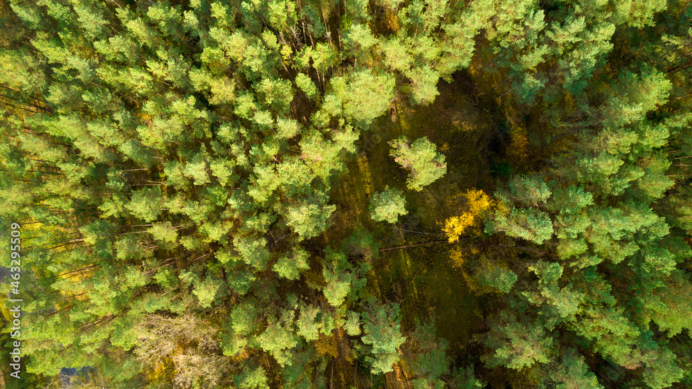 Top view of forests, trees. Old woods of evergreen trees in national park a Unesco world heritage site. Autumn landscape photographed with a drone.