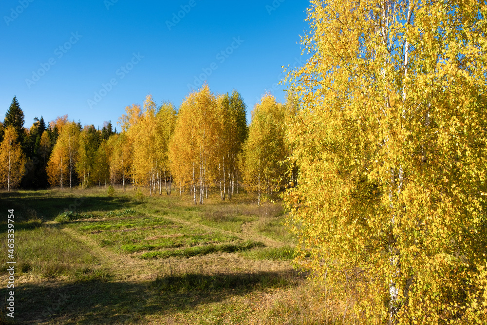Autumn forest with yellow birch leaves and green beds in the foreground.