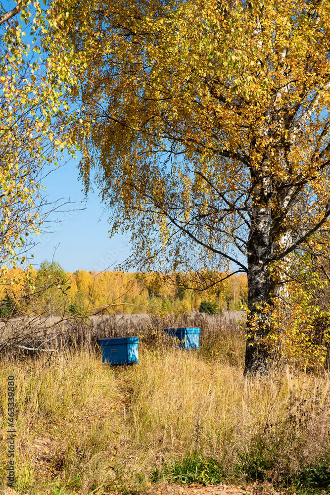 Autumn landscape with two blue beehives standing under tall birches on a sunny day.