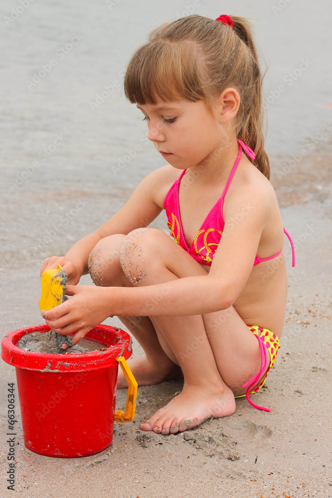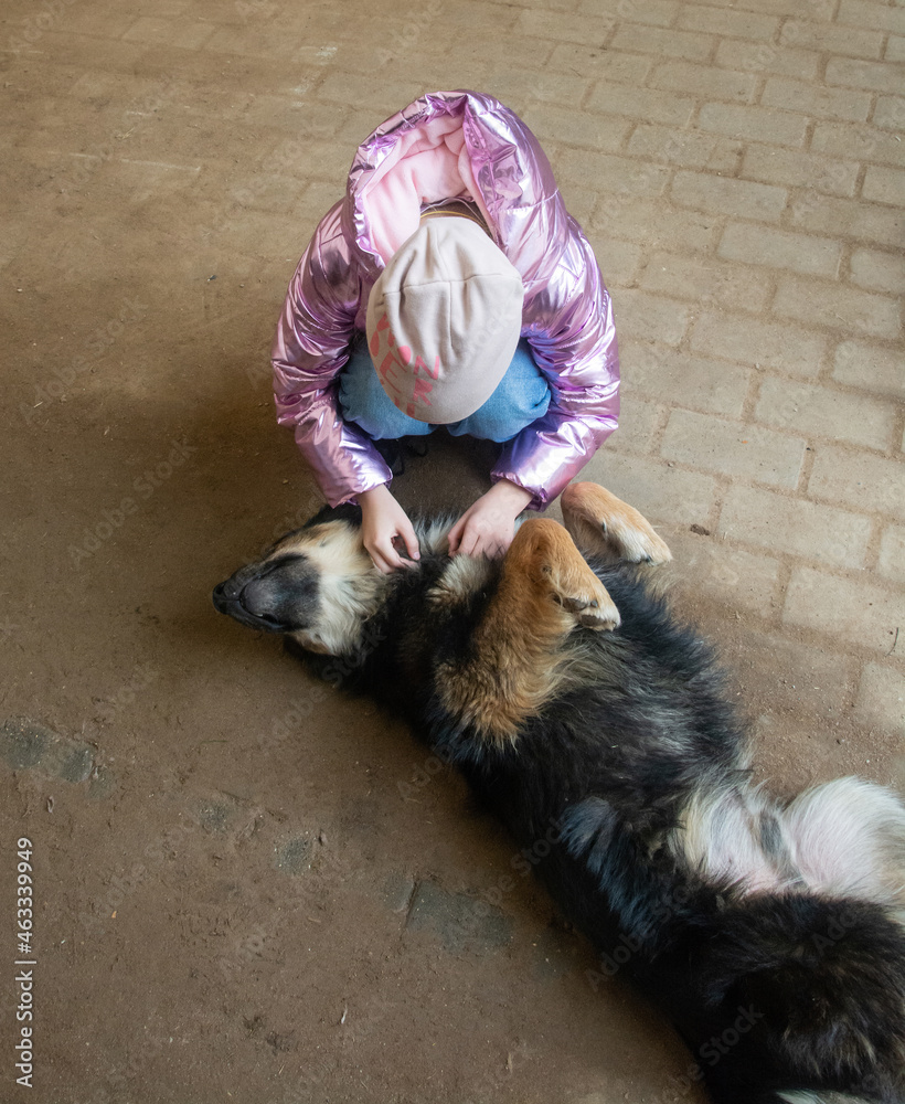 A girl in a pink shiny jacket and blue jeans touches a lying dog.