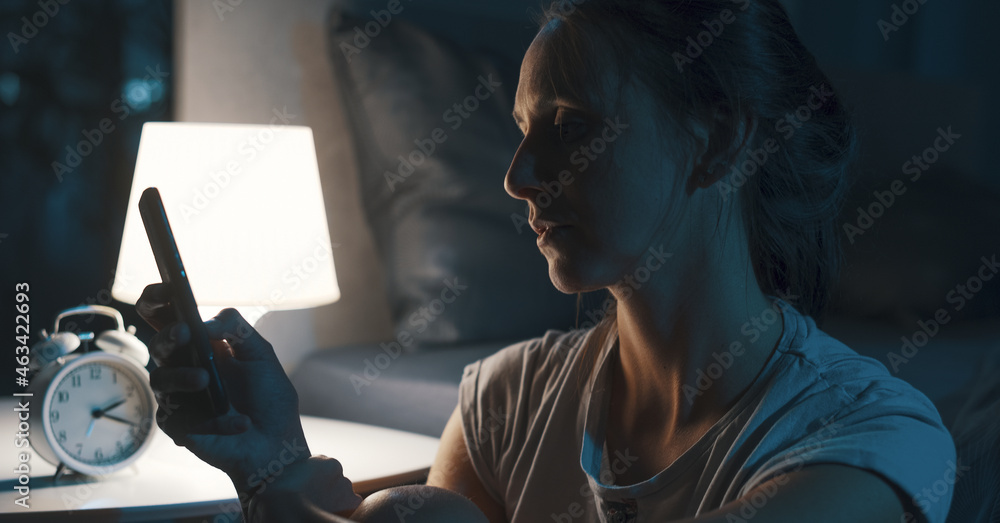 Woman suffering from insomnia and checking her phone
