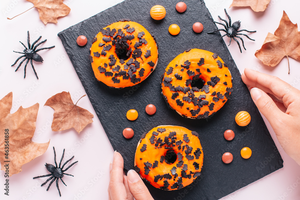 Homemade Halloween doughnuts on black board on table decorated with spiders and dry leaves