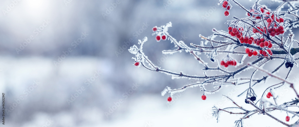 Viburnum bush with frost-covered red berries and branches. Winter Christmas background, panorama
