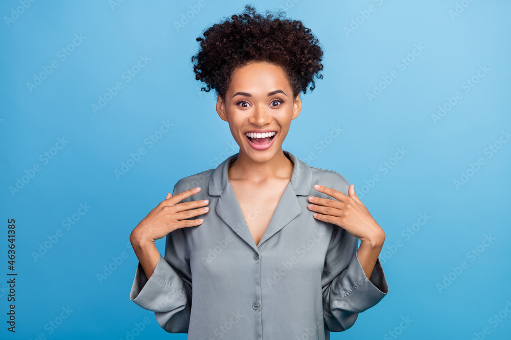 Photo of young excited african girl face reaction unexpected awakening isolated over blue color background