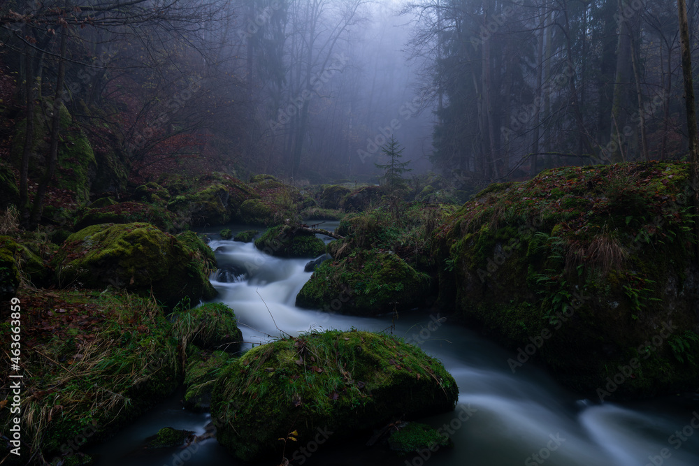 smooth motion of wild water in a river in summer with rocks and stones in the beautiful nature of a forest