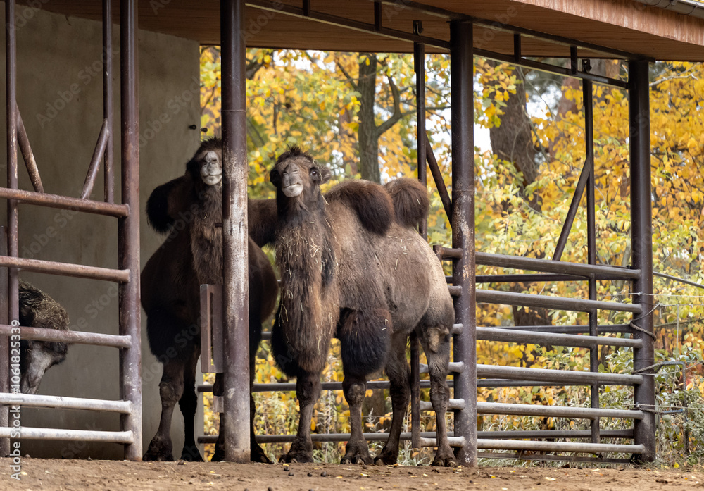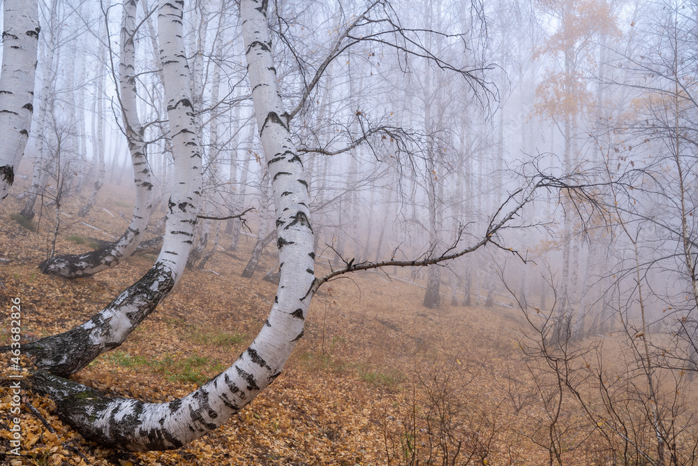 Birch grove in the early autumn morning in the fog. White curved tree trunks and the remains of yellow foliage on the branches. The ground is covered with fallen leaves.