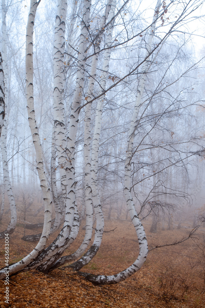 Birch grove in the early autumn morning in the fog. White curved tree trunks and the remains of yellow foliage on the branches. The ground is covered with fallen leaves.