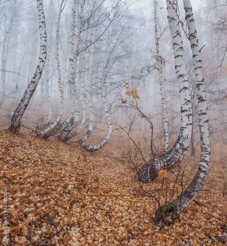 Birch grove in the early autumn morning in the fog. White curved tree trunks and the remains of yellow foliage on the branches. The ground is covered with fallen leaves.