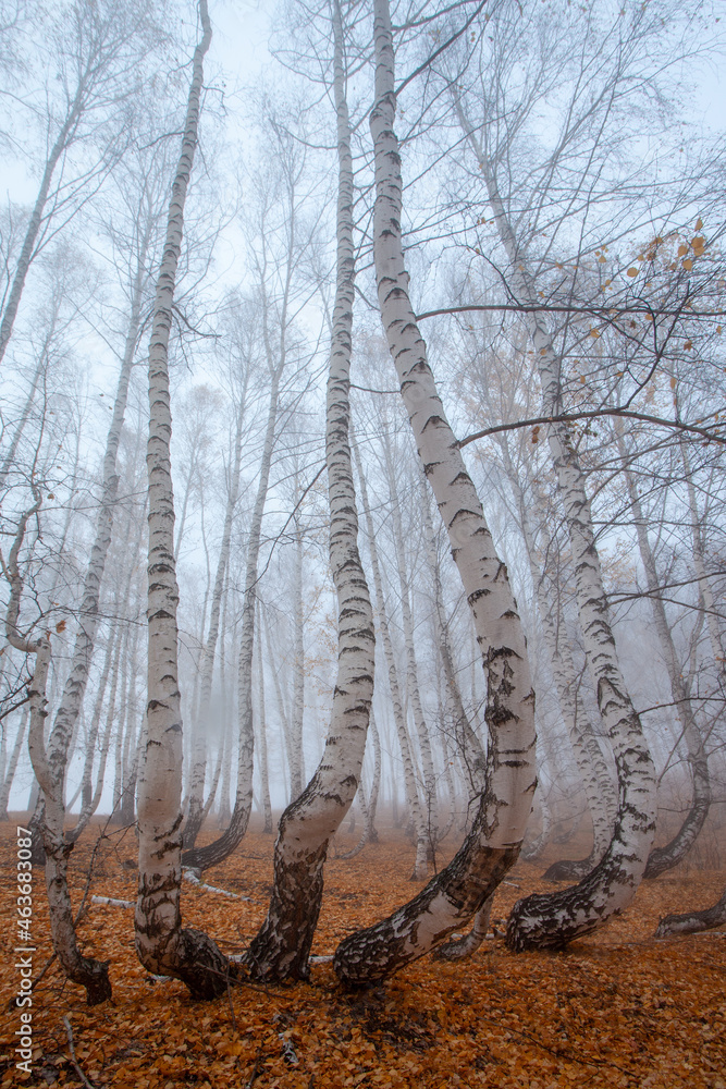 Birch grove in the early autumn morning in the fog. White curved tree trunks and the remains of yellow foliage on the branches. The ground is covered with fallen leaves.