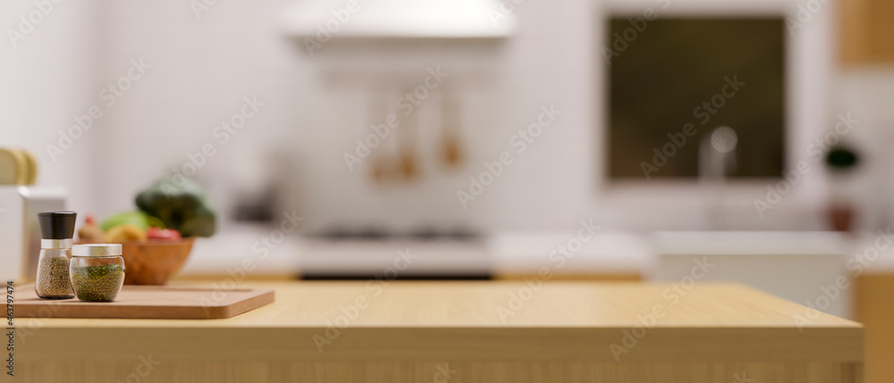 Light wooden kitchen countertop with set of seasoning and space for montage over blurred kitchen background.