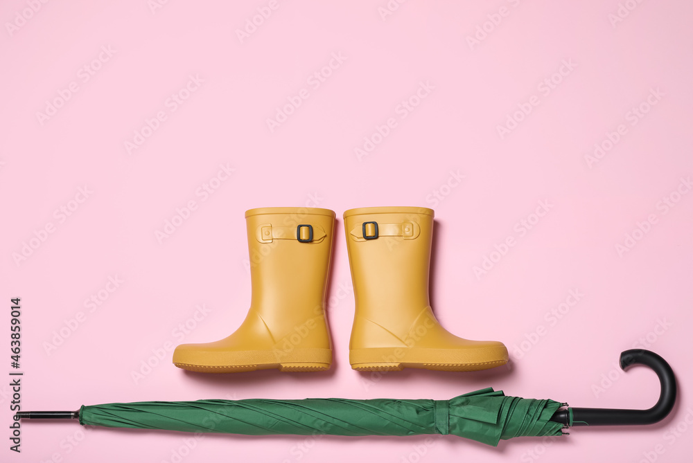Pair of yellow rubber boots near green umbrella on pink background, flat lay. Space for text