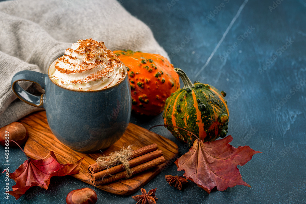Pumpkin spice latte in a blue mug with whipped cream, cinnamon. Blue background decorated autumn leaves, pumkin.