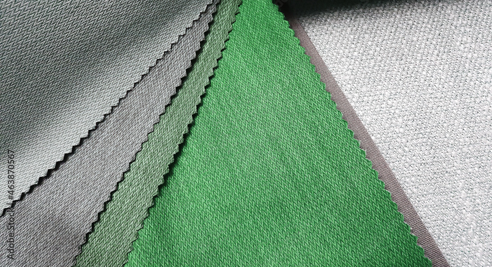 colorful bright fabric pattern palette texture samples in grey and green tone for interior material selection. matching color and texture of drapery material. close up upholstery catalog for choosing.