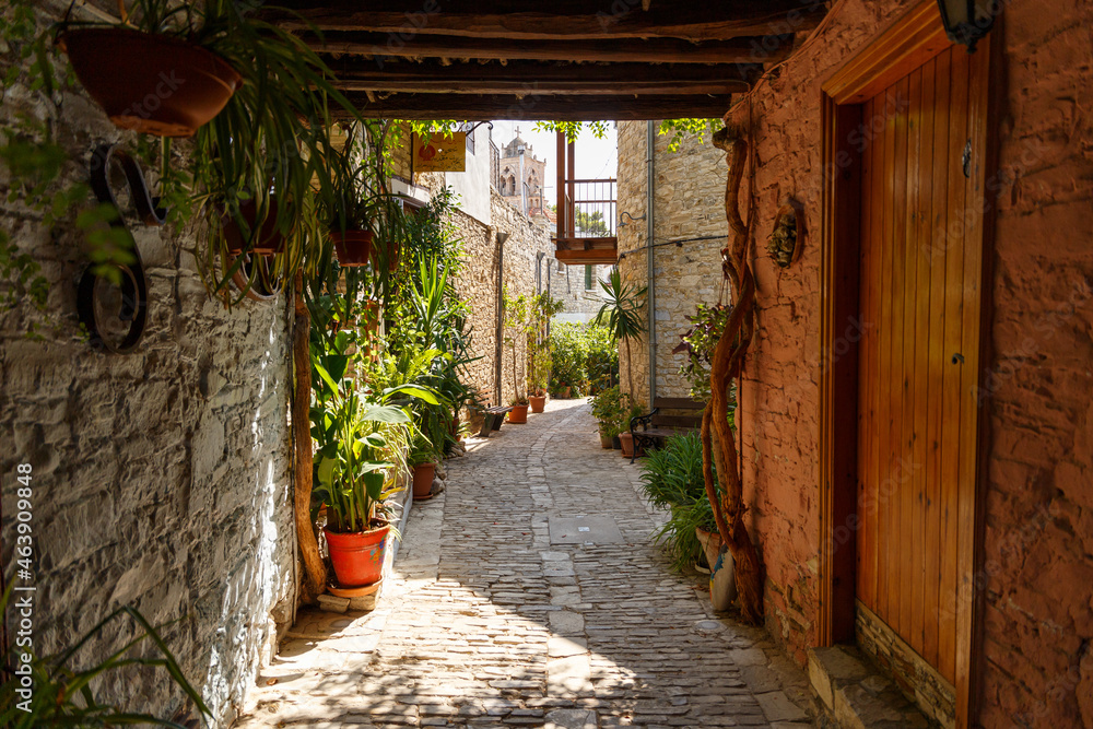 Beautiful narrow streets in an old mountain village. Pano Lefkara village, Cyprus. Street with flower pots and masonry. Stone exterior of old buildings with flowers on the streets