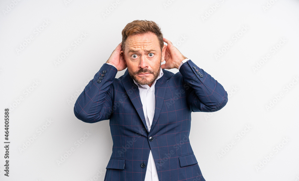 middle age handsome man feeling stressed, anxious or scared, with hands on head. businessman concept