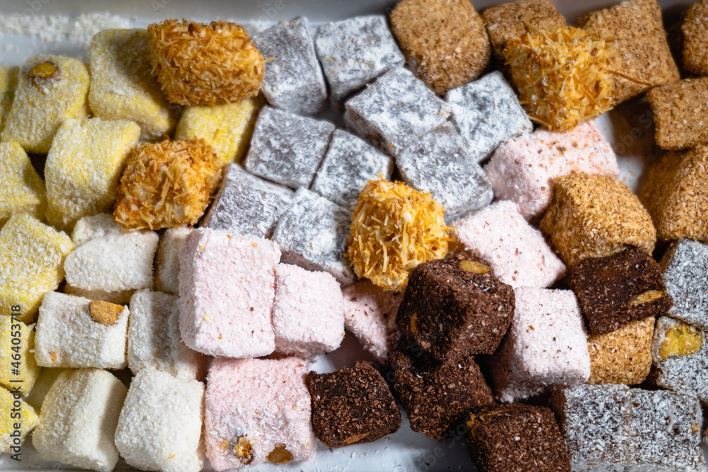 Turkish delight, Lokum in Turkey, assorted varieties of traditional Turkish sweets, close-up selected focus with bokeh