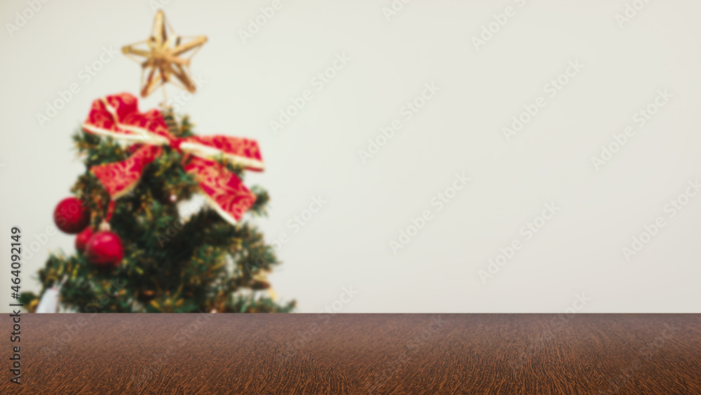 Empty wooden table with chistmas blurry background or wooden desk with holiday bokeh background. Space for text