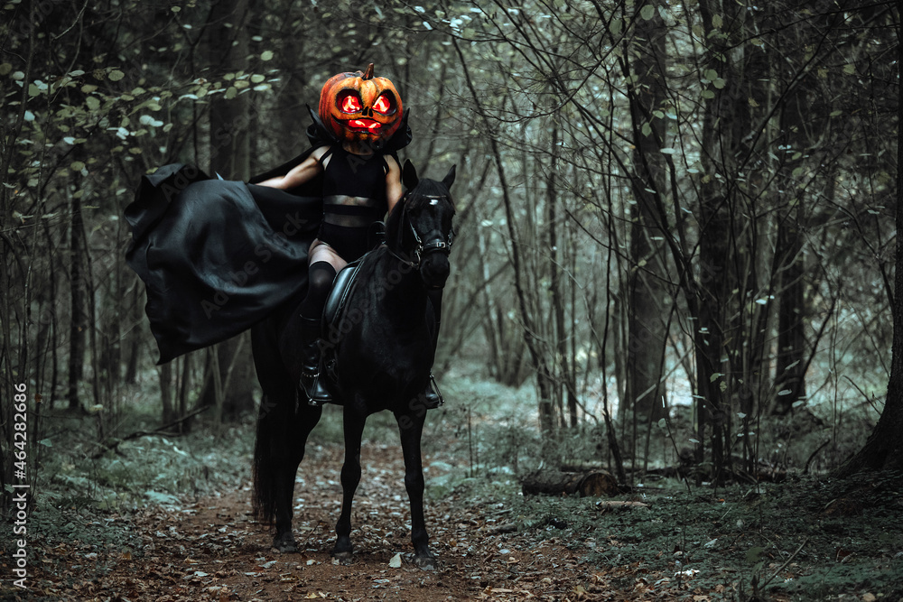the rider is sitting astride a horse. a girl in a long black raincoat with a pumpkin mask with burning eyes. Creepy cosplay shooting for Halloween in the autumn forest. a cloak fluttering in the wind