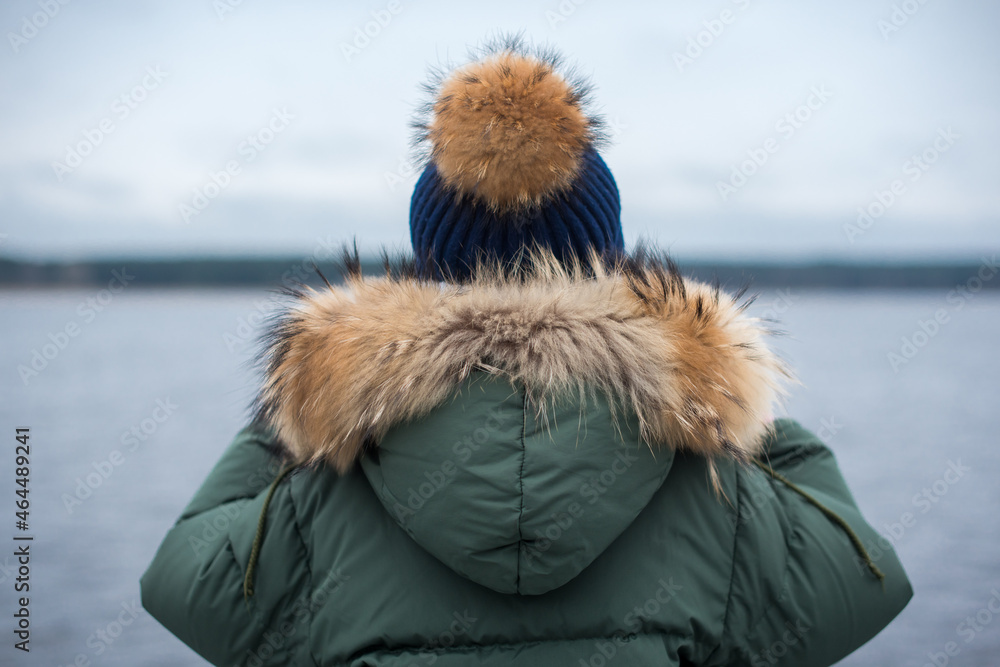 Girl in jacket and hat looking at the sea during winter walks