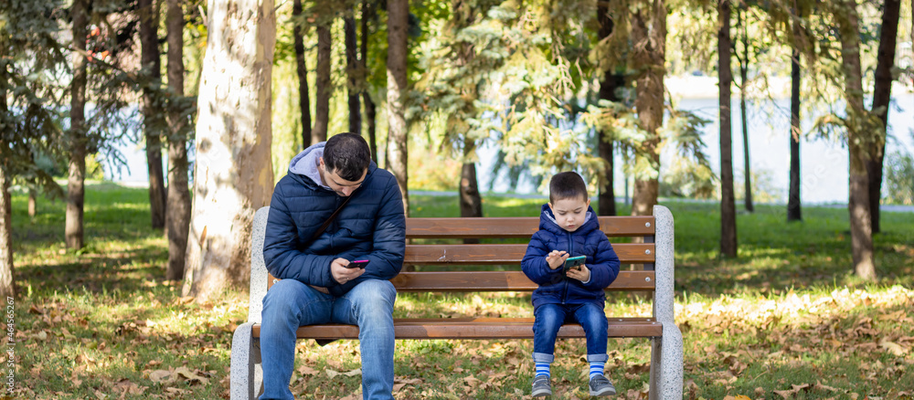 Addicted phone users.little boy sitting on the bench next to his father,both playing on his phone,smartphone,messaging,chatting,social media,mobile games. ignorance, technology, outside,how not to do