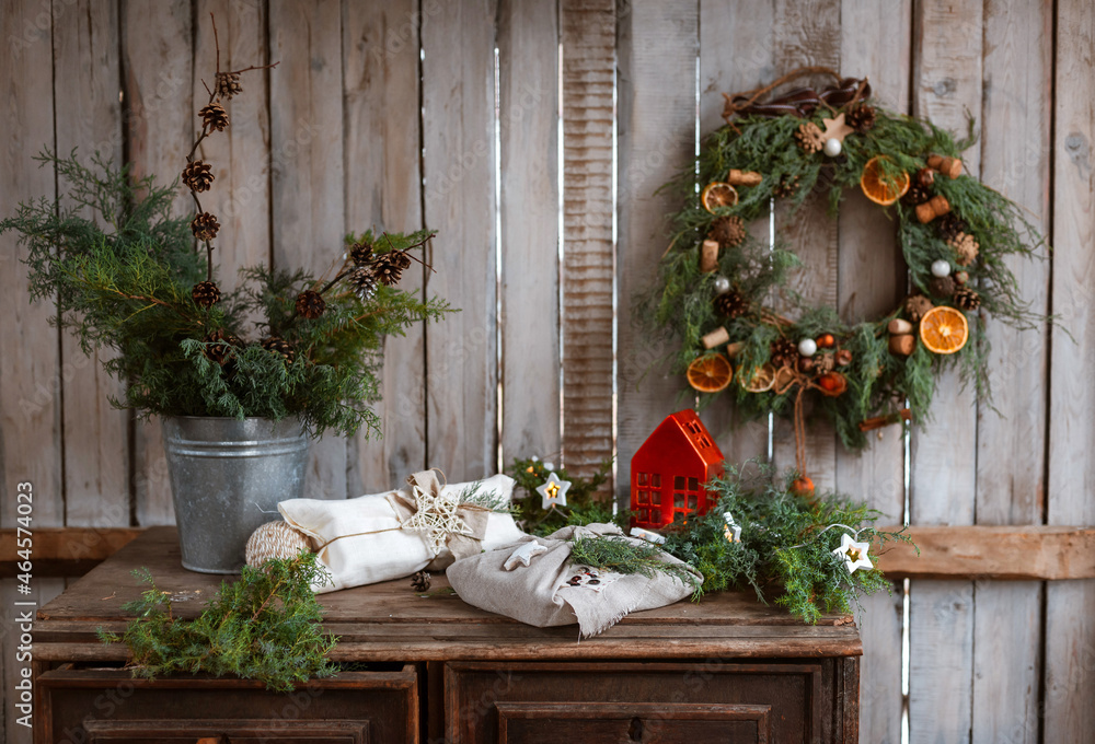 Natural christmas window decoration with handmade reindeer and trees of wood.