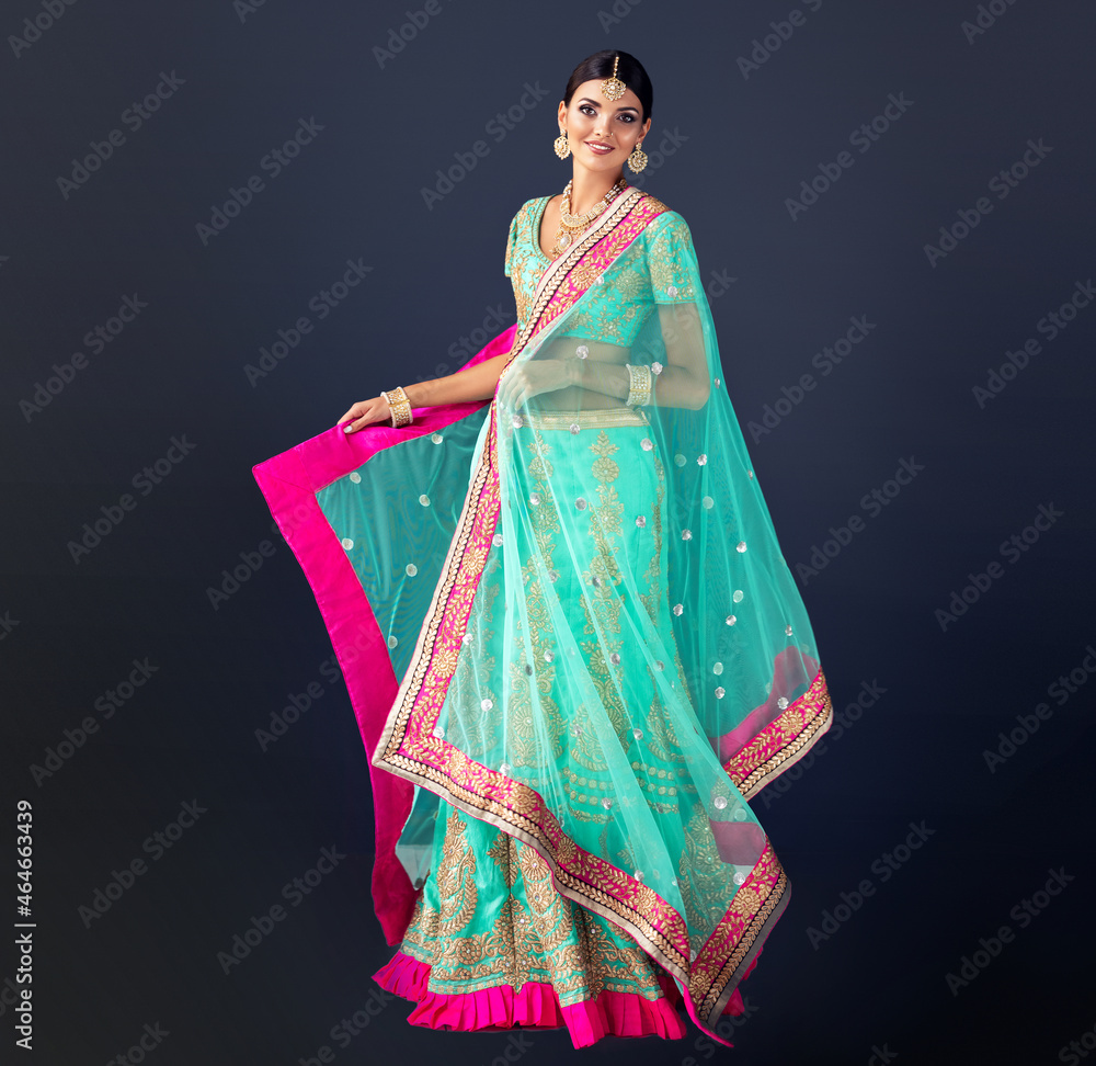 Portrait of beautiful indian girl. Young India woman model with kundan jewelry set. Traditional Indian costume lehenga choli or sari