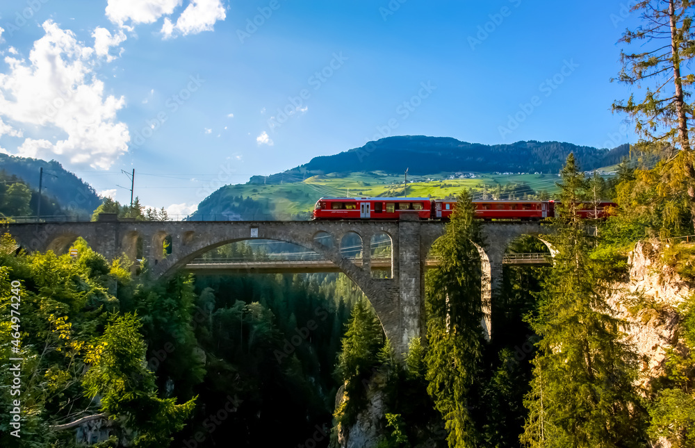 Swiss Red Train Bernina Express at Brusio Viaduct.
