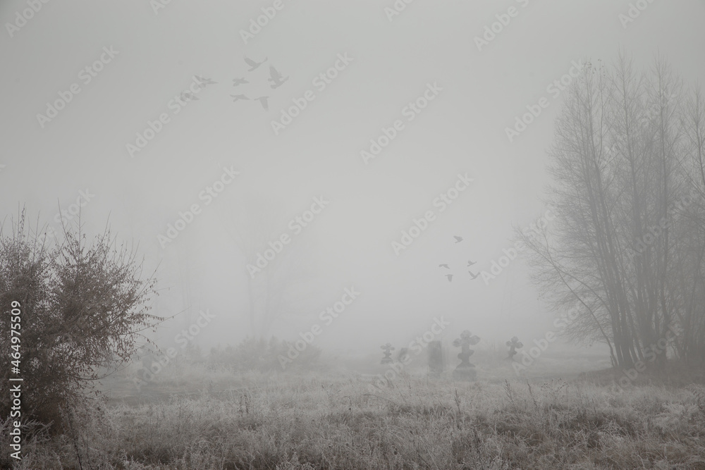 A gloomy mystical landscape with grave crosses and flying crows in a thick fog.