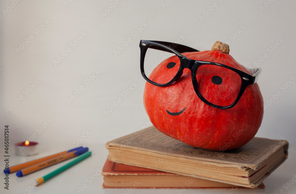 Pumpkin as a student in hipster glasses on books with pens and pencils. Clever pumpkin at school for Halloween in autumn. Nerd pumpkin with glasses.