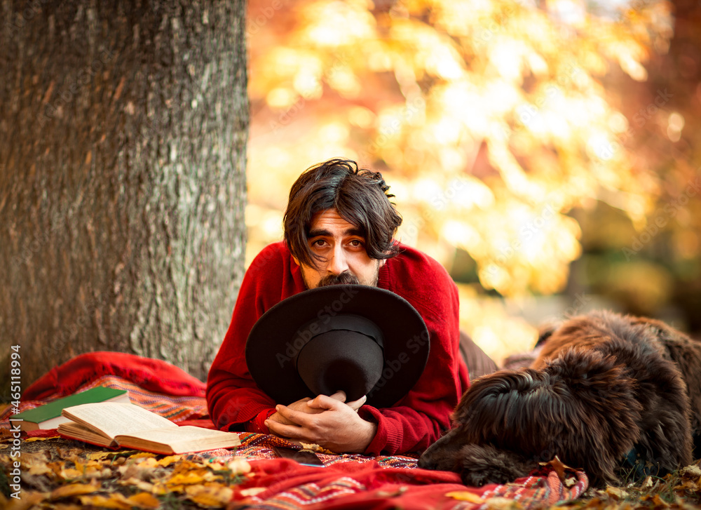 a young man, dark-haired, in a red sweater and hat,sitting under a tree with a pet dog,in the afternoon in the autumn park