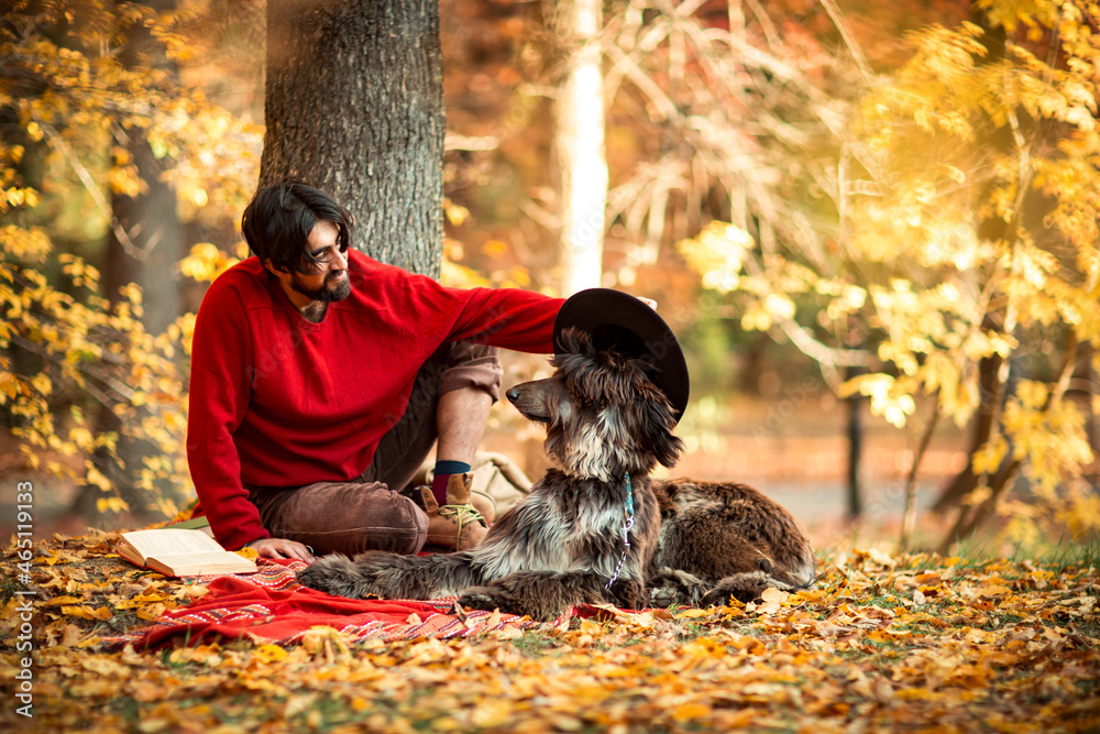 a young man, dark-haired, in a red sweater and hat,sitting under a tree with a pet dog,in the afternoon in the autumn park
