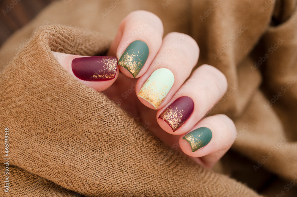 Beautiful matte muted color nails close-up, glittery nail art manicure.
