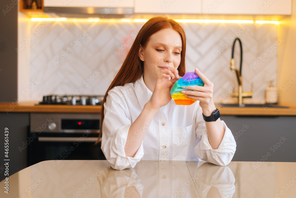 Front view of attractive redhead young woman playing with rainbow pop-it fidget toy sitting at table in modern kitchen room. Happy smiling female with trendy stress and anxiety relief fidgeting game.