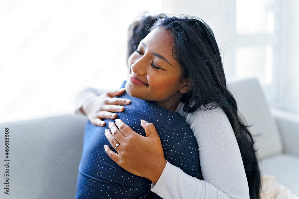 Attractive couple cuddling on the couch at home in the living room