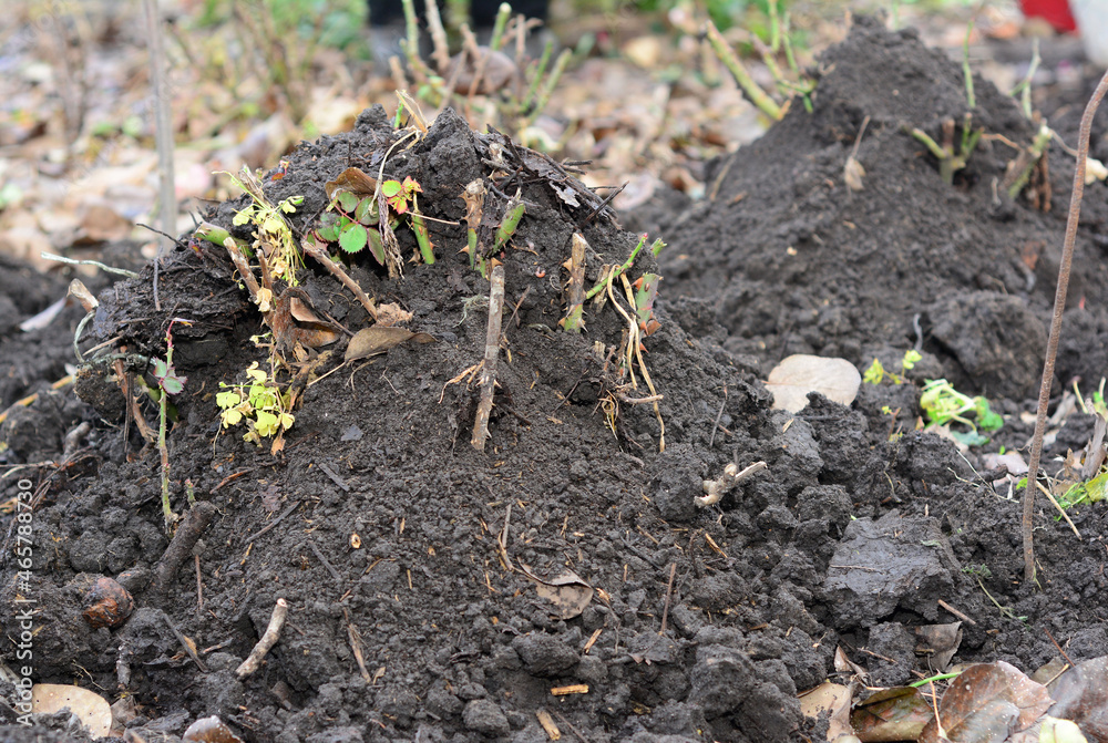 Autumn rose care and winterizing. Mounding pruned roses with soil and mulch to protect rose bush from hard frosts in winter.