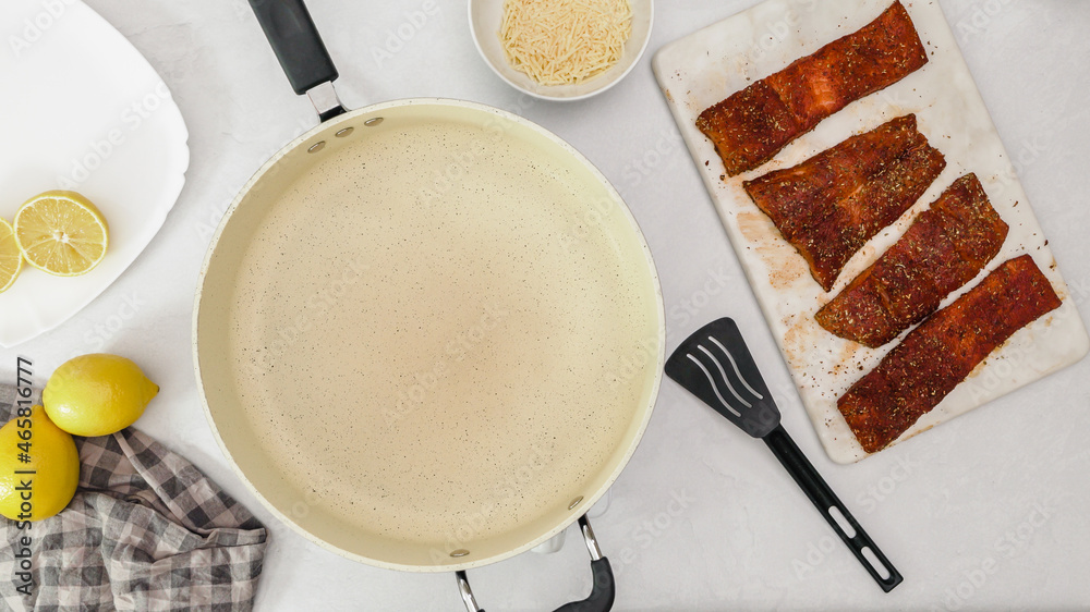 Smoked paprika roasted salmon recipe. Marinated fish pieces close up on cutting board ready to be cooked