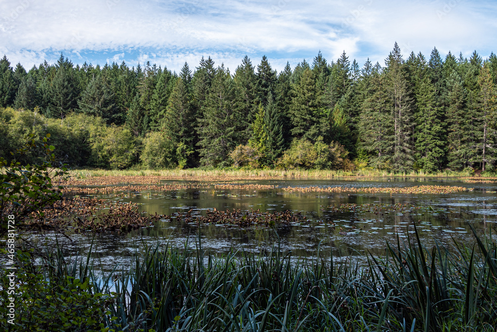 a wall of tall green trees by the lake in the park on a cloudy day