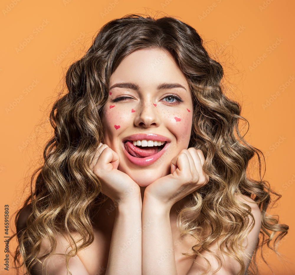 Beautiful face of a young girl with bright emotions. Portrait of a beautiful girl with painted red hearts on her face. An expressive and sensual model with bright makeup poses in the studio.