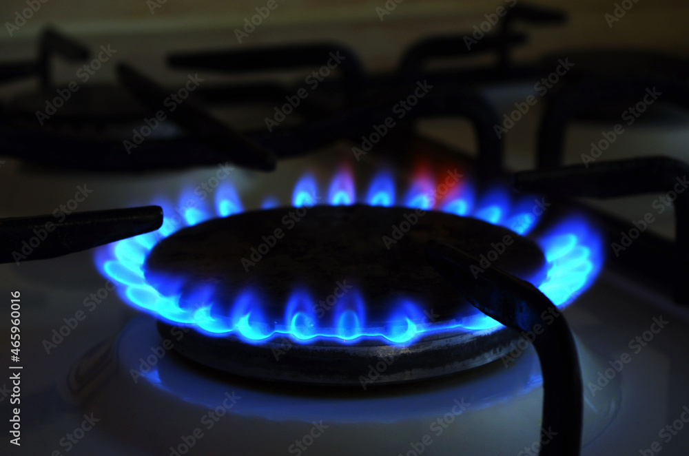 Natural Gas. High prices of natural gas. Blue flames of gas burning from a kitchen gas stove. Energy crisis.