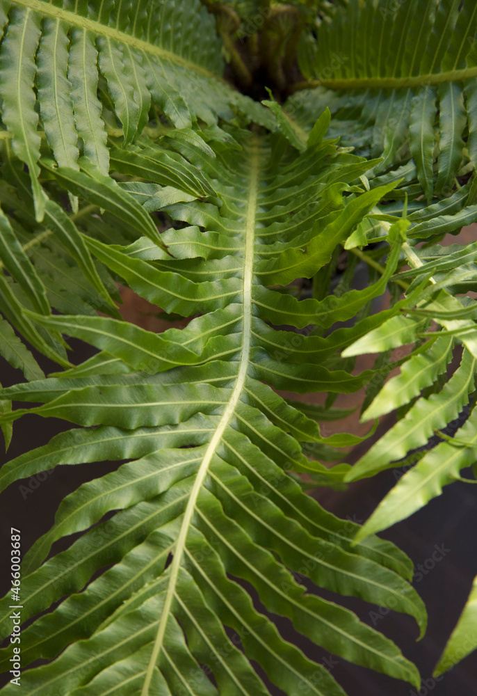 Leaves background. Closeup view of Blechnum gibbum, also known as miniature tree fern, beautiful green frond and leaflets texture and pattern.