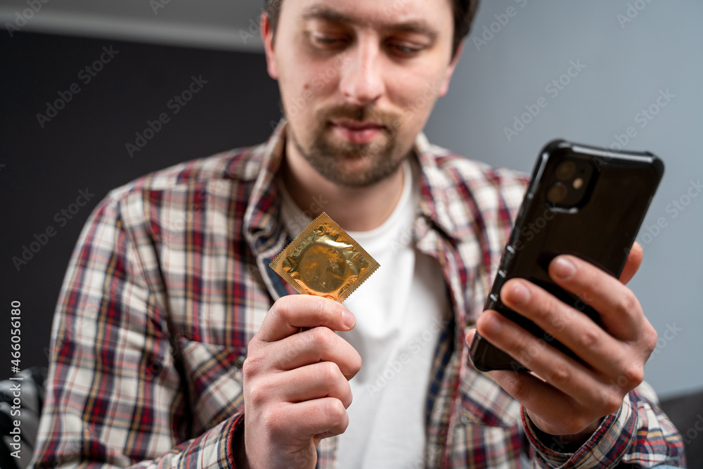 Man promotes healthy sexual relations, protected sex holding a condom while talking on video call with sexual partner. Contraceptive methods in sexual and reproductive health. Concept of erotic chat