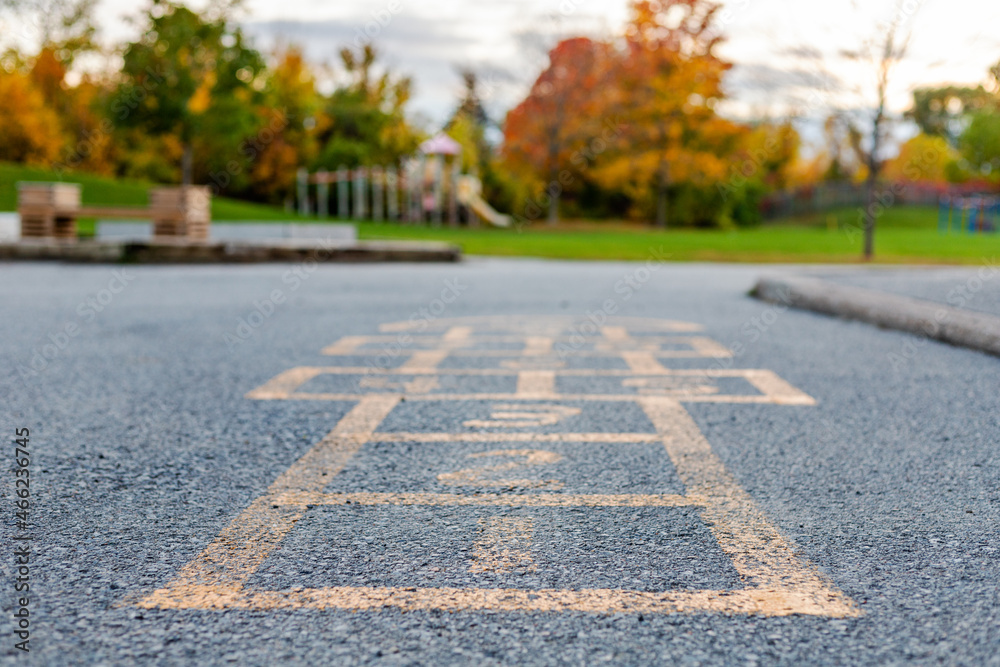 Schoolyard and playground for elementary students in evening in autumn season. Selective focus on hopscotch. Back to school or kindergarten educational concept.