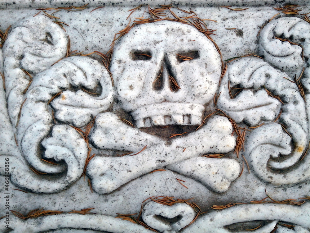 Human skull and crossbones on an old tomb. Memento mori (Latin for "Remember that you will day") symbol.
