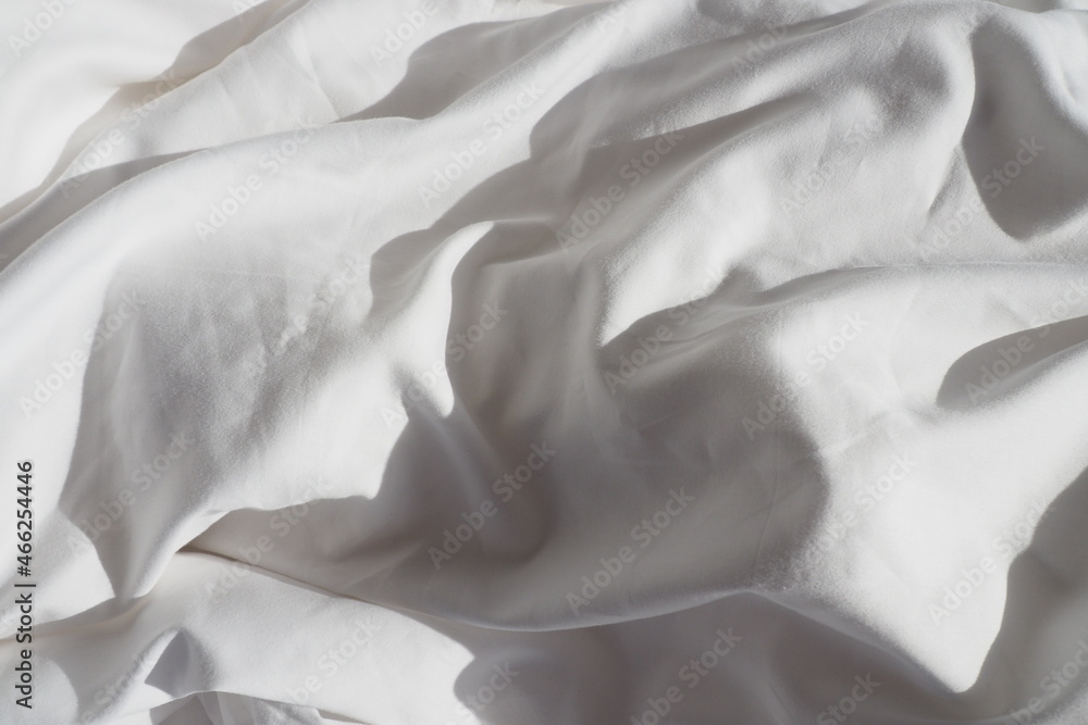 Closeup of beautiful white shiny crumpled polyester fabric sheets on the bed with warm motion and feeling for background and decoration Cloth washing and laundry concept at home