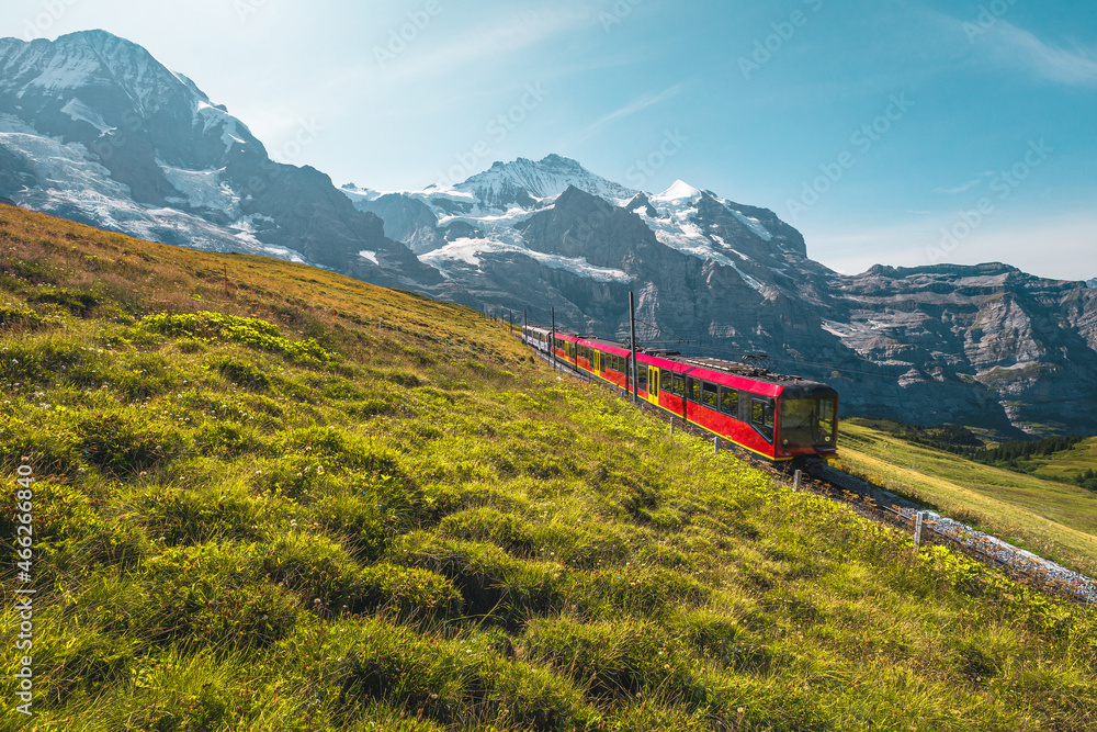 Electric modern tourist train and snowy mountains in background, Switzerland