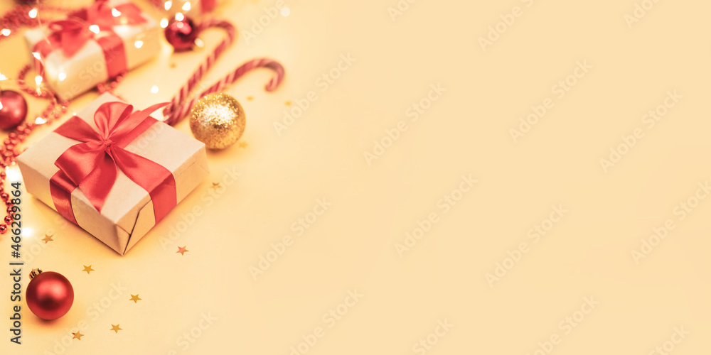 Christmas and New Year blurred backdrop with copy space. Festively decorated Gift boxes, cane lollypops, christmas balls on golden background.